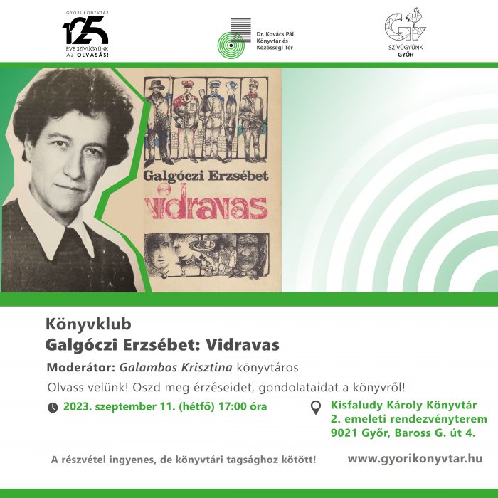 2023. szeptember 11-én (hétfő) 17 órakor a Dr. Kovács Pál Könyvtár és Közösségi Tér Könyvklubjának következő összejövetelén Galgóczi Erzsébet: Vidravas című könyvét tárgyalják ki a Kisfaludy Károly Könyvtár 2. emeleti rendezvénytermében (9021 Győr, Baross G. út 4.). Moderátor: Galambos Krisztina könyvtáros.
