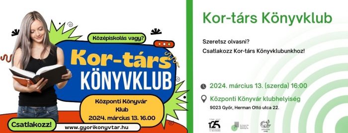A soron következő Kor-társ Könyvklub összejövetele 2024. március 13-án (szerda) a Központi Könyvtár klubhelyiségében lesz 16.00 órakor (9023 Győr, Herman Ottó utca 22.).