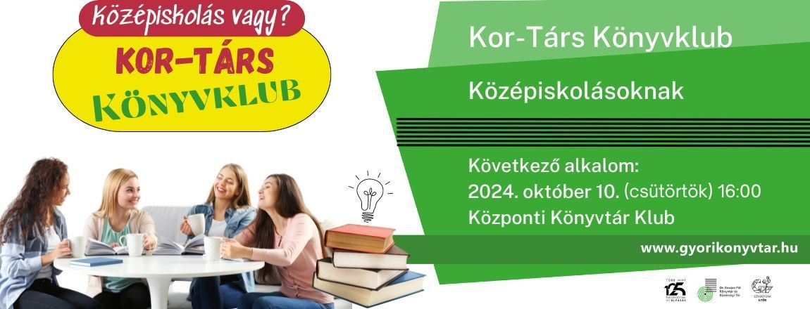 Szívesen ismerkedsz és beszélgetsz a kortársaiddal? Szeretsz olvasni, de nehezen választasz? Csatlakoznál egy (olvasó) közösséghez? Szeretnél új szerzőket megismerni? Gyere el a Kor-társ Könyvklub összejövetelére, havonta egyszer, hétköznap délután (kb. 90 perc), ahol az ismerkedés, beszélgetés mellett a résztvevők megpróbálják megérteni egy-egy szöveg üzenetét, ami megragad, felemel, hat ránk…