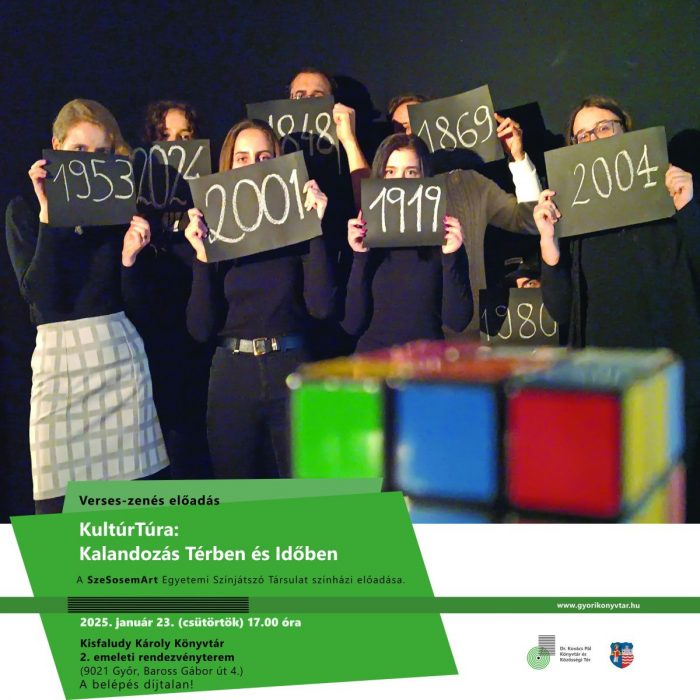 Program: A SzeSosemArt Egyetemi Színjátszó Társulat KultúrTúra: Kalandozás Térben és Időben címmel izgalmas színházi előadás keretében magyar versek és dalok segítségével vezeti végig a közönséget az idő tengerén. A játék során a múlt és a jelen egyedülálló módon fonódik össze, miközben a magyar kultúra különböző alkotásai élednek újra. Egy szórakoztató és tartalmas kalandozás részesei lehetnek a művészetek világában.
