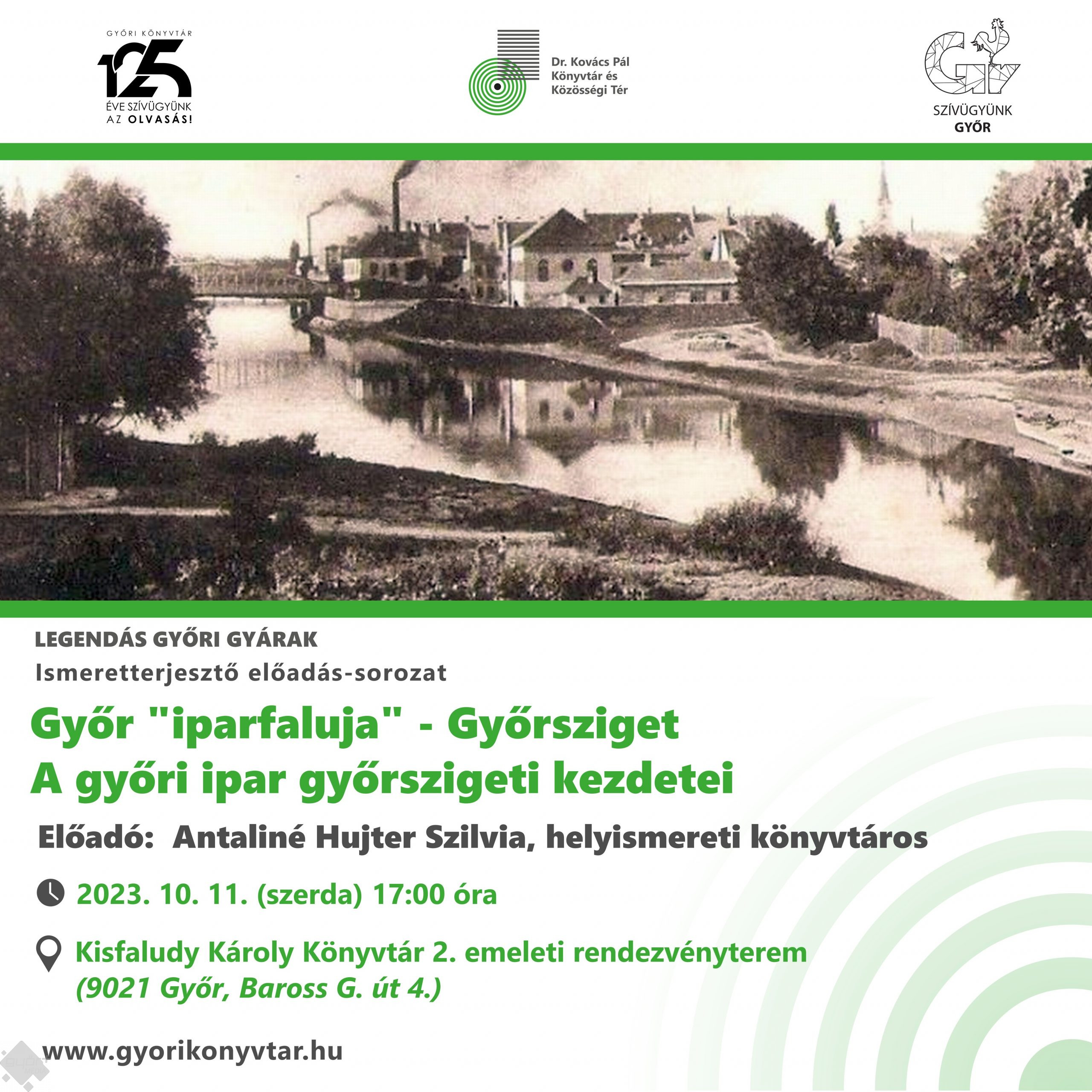 2023. október 11-én (szerda) 17 órakor a Kisfaludy Károly Könyvtár 2. emeleti rendezvénytermében (9021 Győr, Baross G. út 4.) Győr "iparfaluja" - Győrsziget. A győri ipar győrszigeti kezdetei címmel ismeretterjesztő előadást hallhatnak.