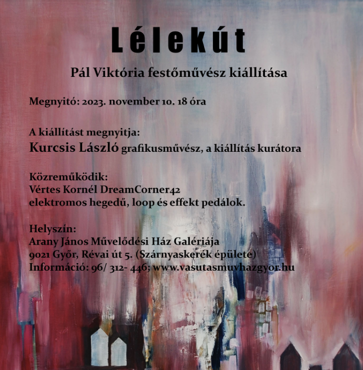 Lélekút címmel Pál Viktória festőművész kiállítása nyílik november 10-én (pénteken) 18 órakor a győri Arany János Művelődési Ház Galériájában (Révai út 5. – Szárnyaskerék épülete).
