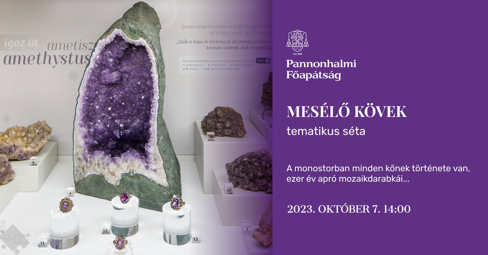 A Pannonhalmi Főapátságban minden kőnek története van, ezer év apró mozaikdarabkái. Ma is szólnak hozzánk. Mesélnek múltról, jelenről, és talán még a jövőt is ismerik. A Mesélő kövek vezetésen résztvevők megismerhetik a szakemberek által az ország egyik legjelentősebb Ásványtárának tartott pannonhalmi gyűjtemény kiemelkedő darabjait, a kőtár kiállított példányait, és megtudhatnak mindent az apátság mozaikképeiről is. Bővebb információ és jegyvásárlás: