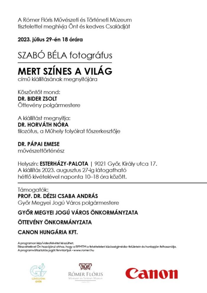 A Rómer Flóris Művészeti és Történeti Múzeum tisztelettel meghívja 2023. július 29-én 18.00 órára Szabó Béla fotográfus "Mert színes a világ" című kiállításának megnyitójára.