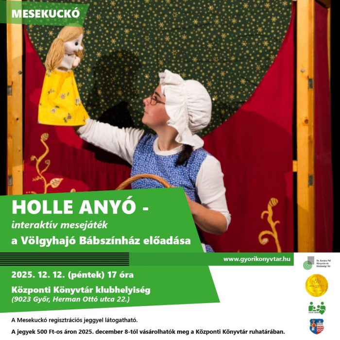 A Dr. Kovács Pál Könyvtár és Közösségi Tér Mesekuckójában 2025. december 12-én, pénteken a Központi Könyvtár klubhelyiségében 17 órakor a Holle Anyó című interaktív mesejátékot láthatják a Völgyhajó Bábszínház előadásában.