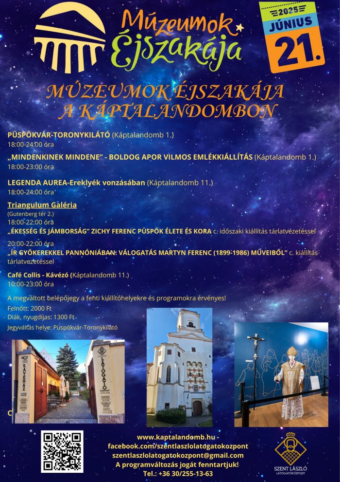 A kiállítás ezen a napon – 18.00-24.00 óra között látogatható. Jegyváltás a Püspökvár-Toronykilátó alatti recepción, 23:00 óráig lehetséges.