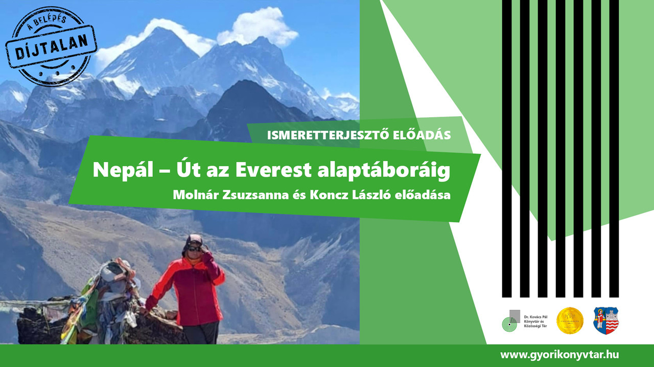 2025. november 11-én (kedd) 17 órakor a Központi Könyvtár klubhelyiségében (9023 Győr, Herman Ottó utca 22.) Molnár Zsuzsanna és Koncz László előadását hallhatják Nepál – Út az Everest alaptáboráig címmel.