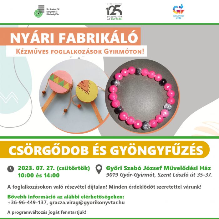 Július 27-én (csütörtök) 10:00 és 14:00 órakor a Győri Szabó József Művelődési Házban (9019 Győr-Gyirmót, Szent László út 35-37.) a gyermekek gyöngyöt fűzhetnek és csörgődobot készíthetnek.