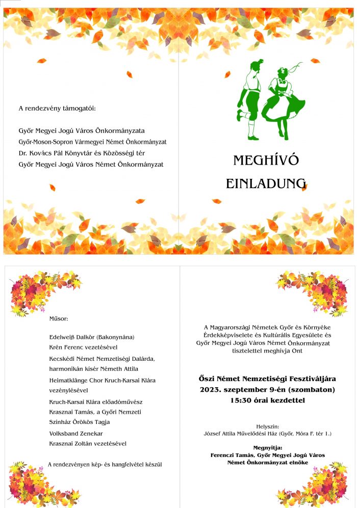 A Magyarországi Németek Győr és Környéke Érdekképviselete és Kulturális Egyesülete és Győr Megyei Jogú Város Német Önkormányzat szeptember 9-én, szombaton 15:30-kor rendezi meg az Őszi Német Nemzetiségi Fesztivált.
