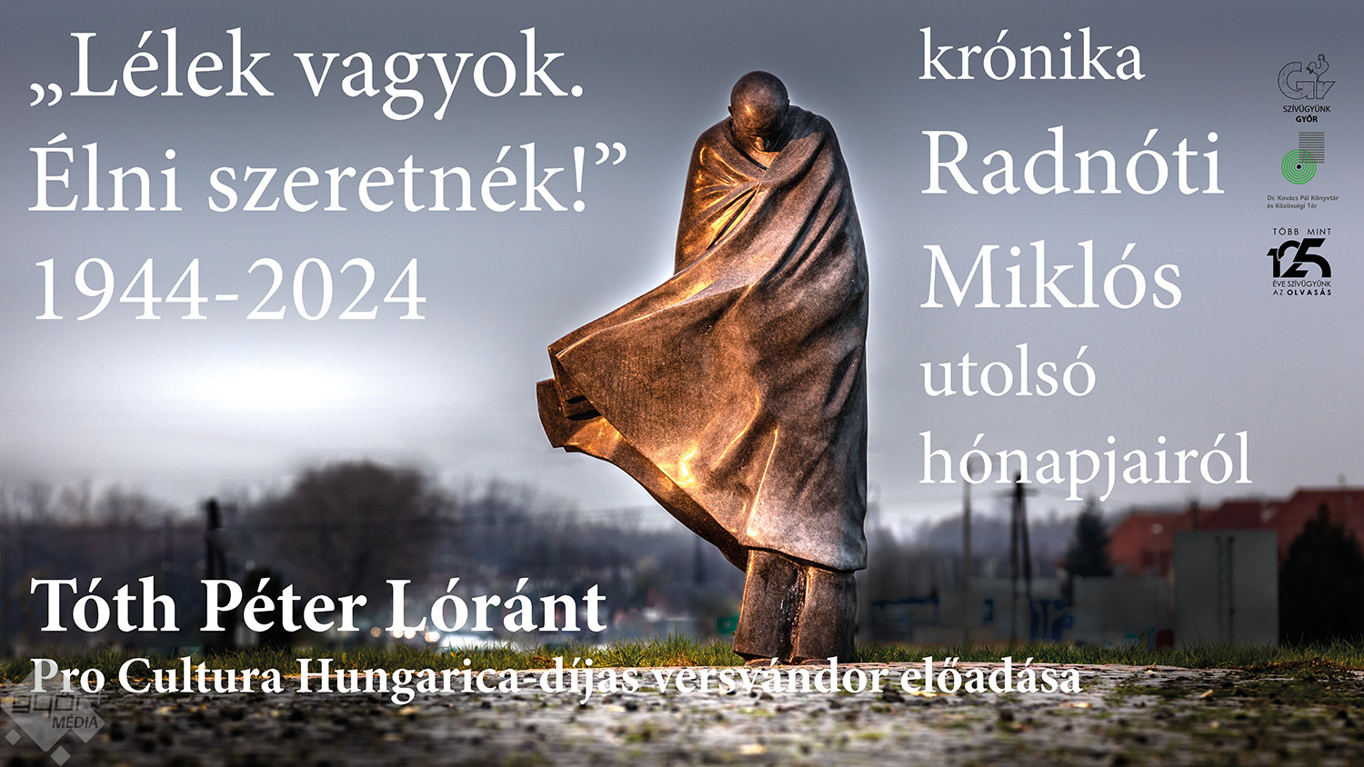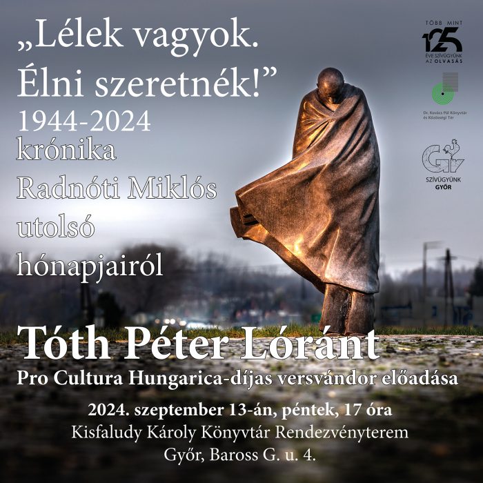 Szeptember 13-án pénteken, 17.00 órakor a Kisfaludy Károly Könyvtár 2. emeleti rendezvénytermében (9021 Győr, Baross Gábor út 4.) a TIT Pannon Egyesülete szervezésében „Lélek vagyok. Élni szeretnék!" krónika Radnóti Miklós utolsó hónapjairól címmel Tóth Péter Lóránt Pro Cultura Hungarica-díjas versvándor előadását hallhatják.