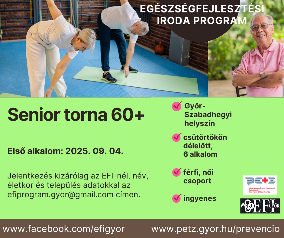 A közös mozgás öröme minden korosztályban ajánlott, ahogy a jókedv is. Nos, az Egészségfejlesztési Iroda (EFI) által meghirdetett „Senior Torna 60+” rendezvény pontosan erről szól.