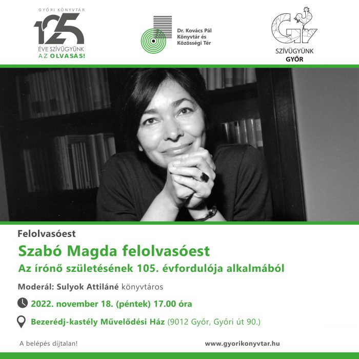 2022. november 18-án (pénteken) 17 órakor a Bezerédj-kastély Művelődési Házban (Győr, Győri út 90.) Szabó Magda írónő - az Abigél, Az ajtó, Az Őz és sok más népszerű kötet szerzője - születésének 105. évfordulója alkalmából felolvasóest kezdődik.