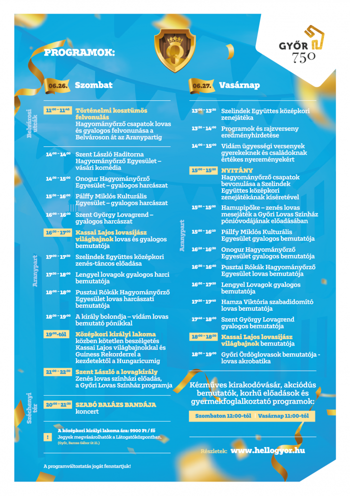 Idén a korhű érzést a hazai hagyományőrző csapatok mellett, lengyel lovagok teszik gazdagabbá, amelyet kicsik és nagyok egyaránt élvezhetnek. A hagyományokhoz híven a Győri Lovas Színház programja mellett gyermek foglalkozások, kirakodóvásár, állatsimogató, mesterségbemutató, rovásoktatás és még sok izgalmas program várja az esemény iránt érdeklődőket. Rendhagyó módon Kassai Lajos Lovasíjász világbajnok és Szabó Balázs bandája is növeli a rendezvény színvonalát.