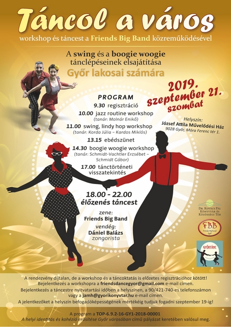 Táncos workshop és azt követően táncest lesz a Friends Big Band közreműködésével szeptember 21-én (szombaton) 9.30-tól 22 óráig a József Attila Művelődési Házában (Győr, Móra park 1.).