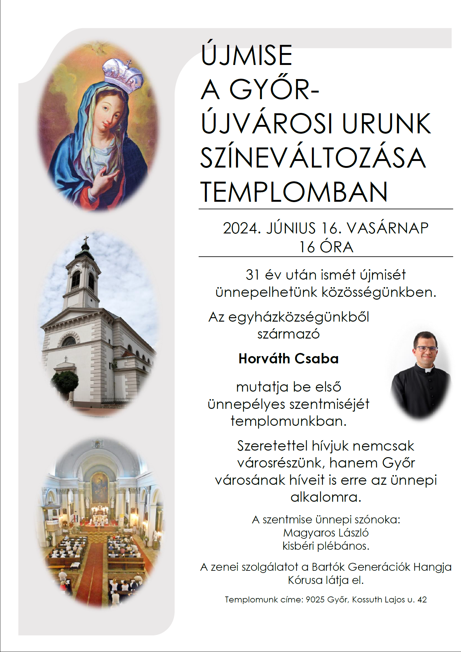 A Győr-Újvárosi Urunk Színeváltozása templom, 2024. június 16-án, vasárnap 16 órai kezdettel, az egyházközségükből származó Horváth Csaba első ünnepélyes szentmiséjét fogják ünnepelni. A nem mindennapi ünnepi szentmisére szeretettel várják nemcsak az újvárosi, hanem a Győr és környékéről érkező híveket is. Az eseményt megtiszteli jelenlétével Szeles Szabolcs győri alpolgármester.