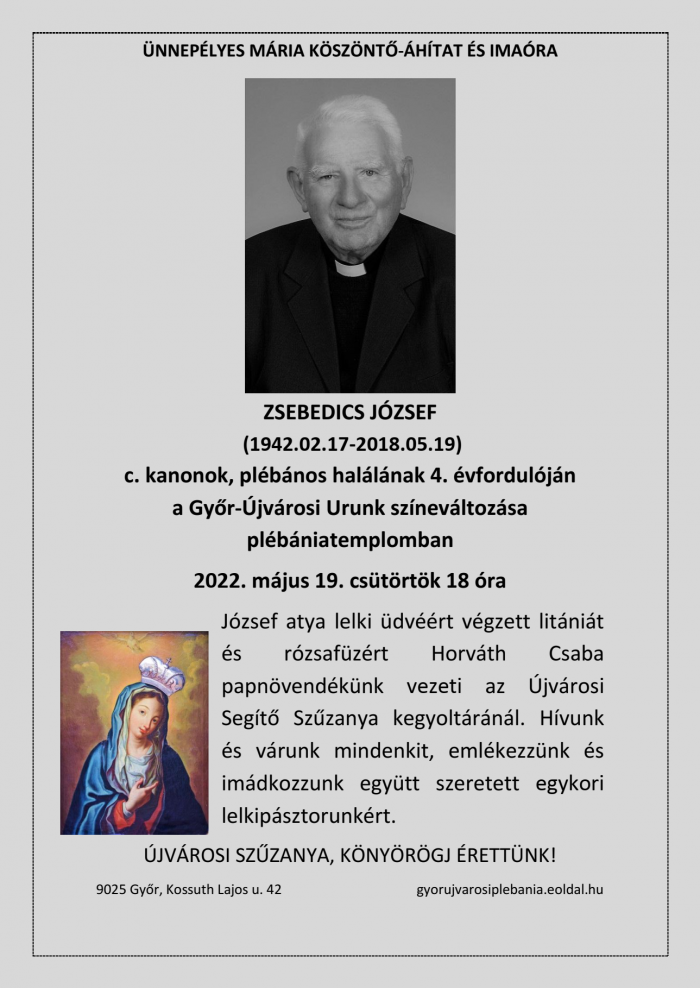 Zsebedics József atya halálának 4. évfordulójára emlékezik a Győr-Újvárosi Urunk színeváltozása egyházközség.