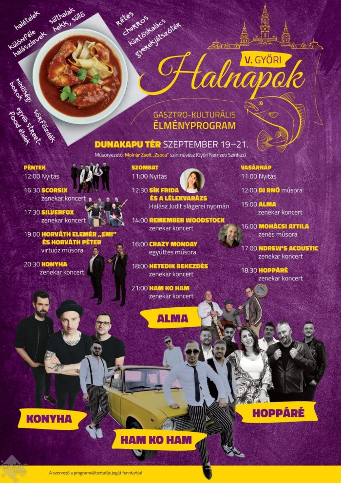 Már ötödik alkalommal rendezik meg a Győri Halnapokat, amely rövid idő alatt lett nemcsak a helyiek, de környékbeliek és turisták kedvence. Az ősz legnagyobb „gasztrokulturális” eseményén a konyhai és zenei ínyencségek egyaránt kiemelt helyet kapnak. A folyók, horgászok és finom halétkek városában a Dunakapu tér három napra megtelik ínyenc közönséggel és finom étkek illatával. A szervezők az V. Győri Halnapokra ezúttal elérhetőbb áru „fesztiválételekkel” gazdag hal és italkínálattal, nagyszerű programokkal készülnek.