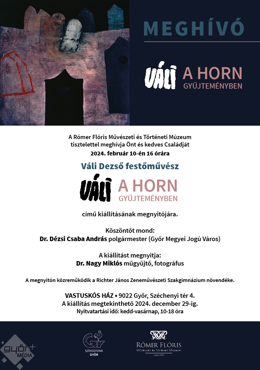 A Rómer Flóris Művészeti és Történeti Múzeum tisztelettel meghívja Önt és kedves Családját 2024. február 10-én 16 órára Váli Dezső festőművész Váli a Horn Gyűjteményben című kiállításának megnyitójára.