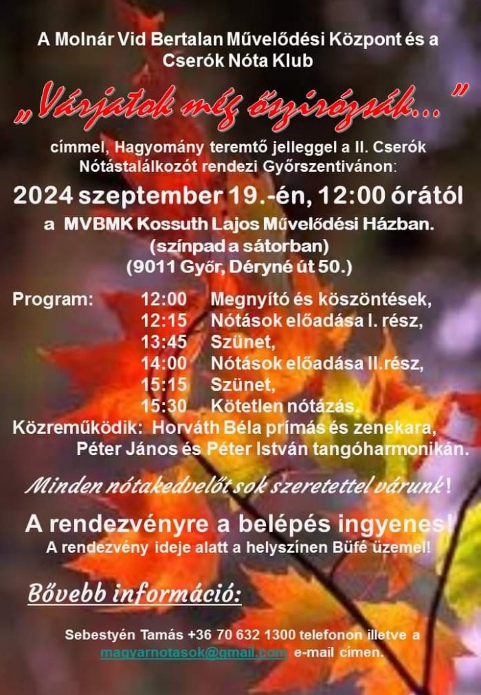 A Molnár Vid Bertalan Művelődési Központ és a Cserók Nóta Klub "Várjatok még őszirózsák" címmel, hagyományteremtő jelleggel a II. Cserók Nótástalkozót rendezi Győrszentivánon.