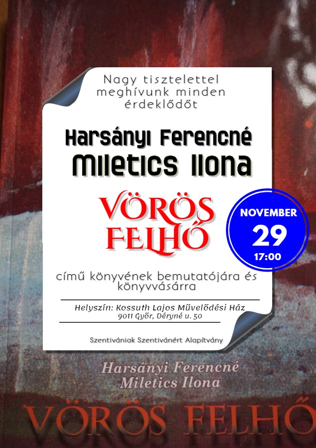 Vörös felhő című könyvét mutatja be Harsányi Ferencné Miletics Ilona november 29-én 17 órakor a Kossuth Lajos Művelődési Házban (Győrszentiván, Déryné u. 50).