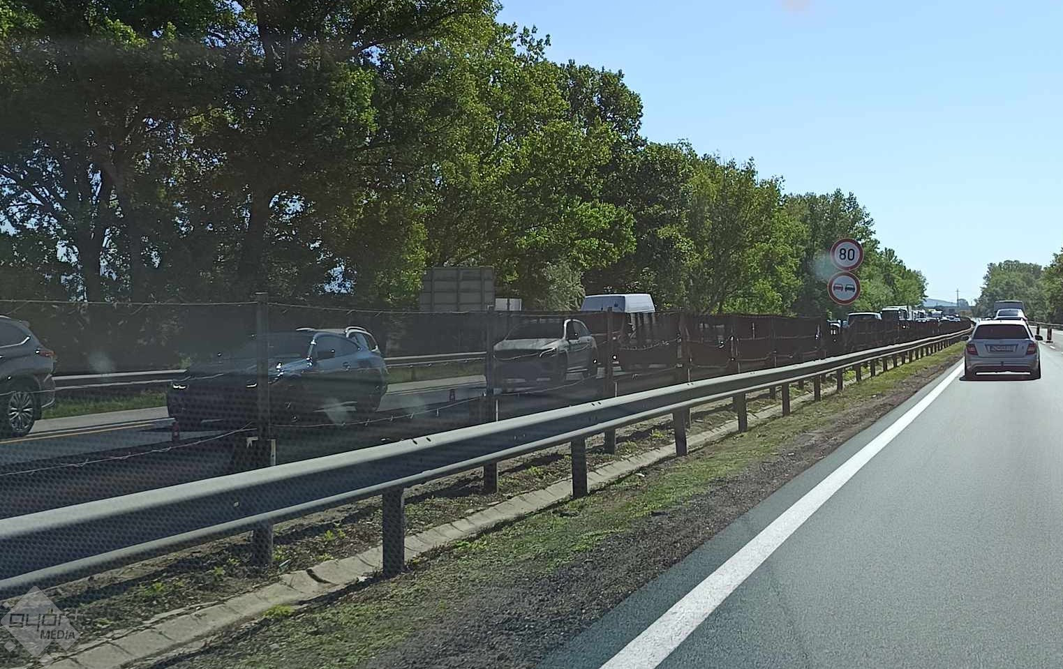 Az M1-es autópályán, a Hegyeshalom felé vezető oldalon, Tata térségében, a terelésben, két személygépjármű összeütközött. A 71-es km-nél a forgalom egy sávon halad. A torlódás 4-5 km.