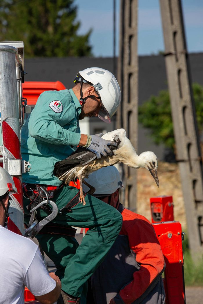 A Fertő-Hanság Nemzeti Park Igazgatóság kérte az E.ON segítségét a mentésben: a szakemberek a lehető leghamarabb a helyszínre érkeztek. Kosaras autóval óvatosan megközelítették a fészket, a Nemzeti Park természetvédelmi őre magához húzta a fiókát és levágta a lábáról a rátekeredett bálamadzagot. Ezután szakszerűen összecsukta a madár szárnyait, nehogy a még ügyetlenül repülő fióka kiugorjon a fészekből. A bálamadzag minden részét eltávolította a fészekből, ahogy azt gyűrűzéskor is teszik, hogy a jövő generációit ne akadályozza mozgásukban. Ezt követően az E.ON-os szakemberek biztonságosan a földre szállították a gólyafiókát.