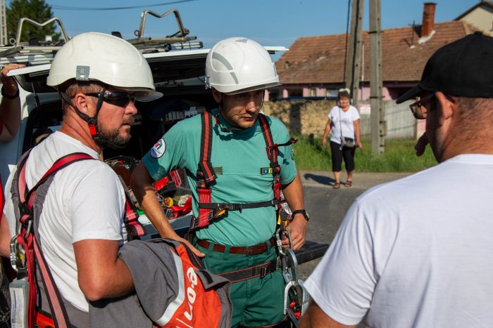 A Széchenyi utcában a lakosok vették észre, hogy baj van: a kis gólyák egyike hiába verdesett a szárnyával, a fészekből kirepülni nem tudott. Egy ideje lábra sem állt, el is maradt fejlődésben a társaitól, valószínűleg mert nem volt képes fürgén élelemért nyúlni. A helyiek drónnal is megnézték a fészket, ekkor derült ki, hogy a gólya egyik lába be van akadva egy bálamadzagba, abból pedig egyedül nem tud kiszabadulni.