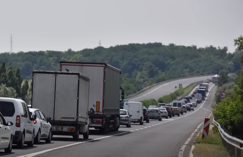 A kamion a 44-es km-nél belóg a külső sávba, ezért a nagyobb járművek sávváltással kénytelenek kikerülni. A torlódás közel 2 km-es.