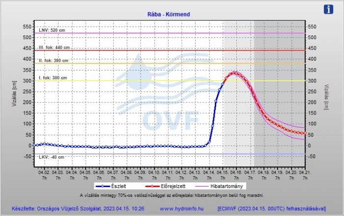 A nagyobb nyugat-magyarországi folyók közül a legjelentősebb árhullám a Rábán indult el. Körmendnél a folyó vízszintje az I. fokú árvízvédelmi készültségi szintet is elérte a hétvégén, nagyjából 3 és fél méteres vízszintemelkedés volt tapasztalható a csütörtöki vízálláshoz képest. A hét elején viszont jelentős apadás várható a körmendi mérőpontnál.