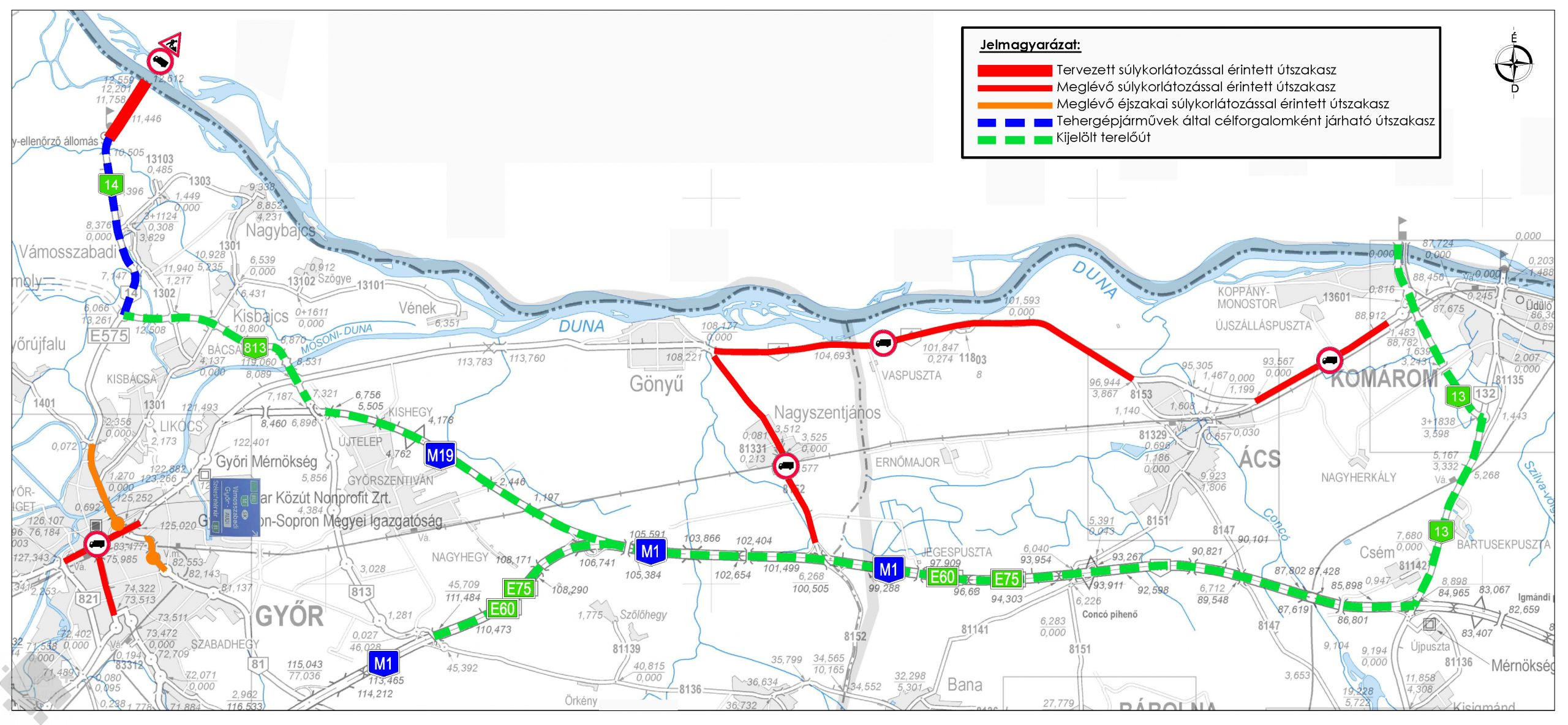 A 3,5 tonna feletti gépjárművek a magyarországi oldalon a 14-es főút – 813-as főút – M19-es autóút – M1-es autópálya – 13-as főút útvonalon közlekedhetnek a felújítás ideje alatt. A kijelölt terelőutat sárga táblák jelzik majd. A tehergépjárművek kizárólag célforgalom esetében használhatják a 14-es főúton a 813-as főúti csomóponttól a Vámosszabadi határig tartó útszakaszt.