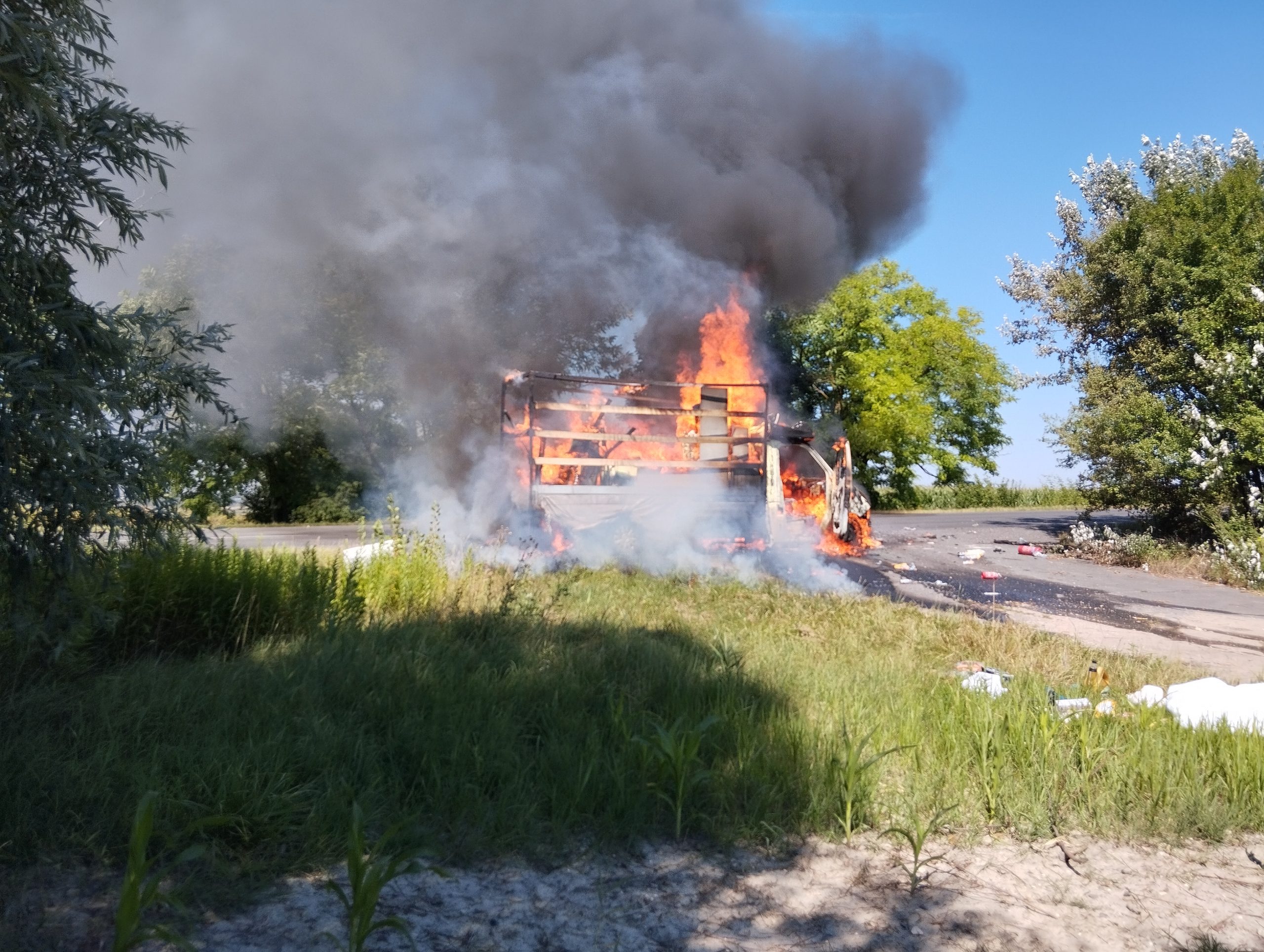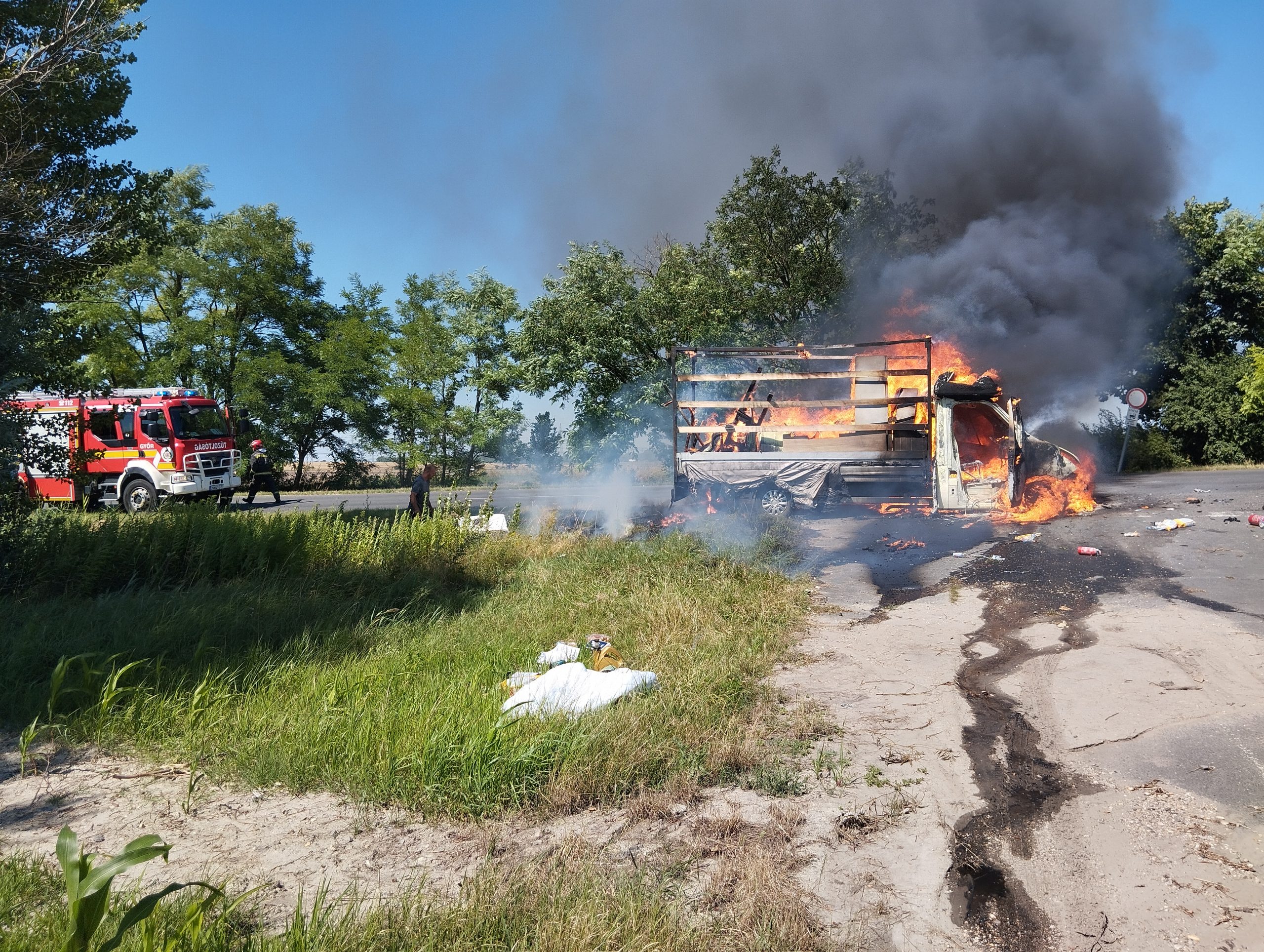 Kigyulladt egy bútort szállító kisteherautó a Győr és Győrság közötti út 2-es kilométerszelvényénél. A tűz a rakományon kívül az aljnövényzetre is átterjedt. A győri hivatásos tűzoltók két vízsugárral előbb körülhatárolták, majd eloltották a tüzet – írtuk július 15-én, szombaton.