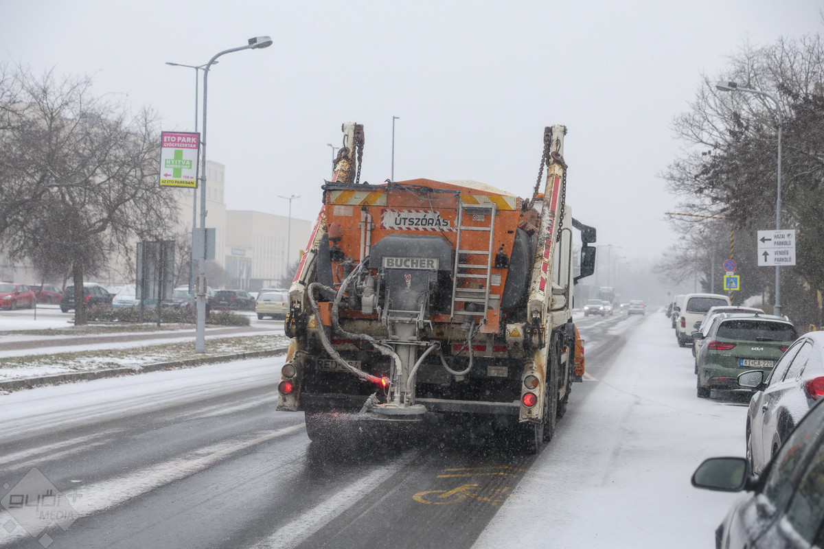 A Győr-Szol Zrt. munkatársai és járművei a technológiai előírásoknak megfelelően elsőként a hidakon, felüljárókon és forgalmas útvonalakon végezték a munkálatokat.