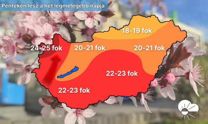 A legmelegebb tájakon, elsősorban a Kisalföld nyugati felén és Sopron környékén karcolhatjuk a 25 fokot, ami meteorológiai értelemben már nyári napnak számít. Egy nyugat felől közelítő hidegfront előtt a déli-délnyugati szél élénk, a Dunántúlon sokfelé erős lesz.
