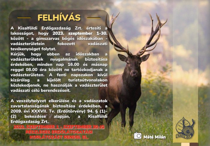 A szarvasbőgés ideje alatt, azaz 2023. szeptember 1. és 30. között, a Kisalföldi Erdőgazdaság részleges erdőlátogatási korlátozást vezet be.