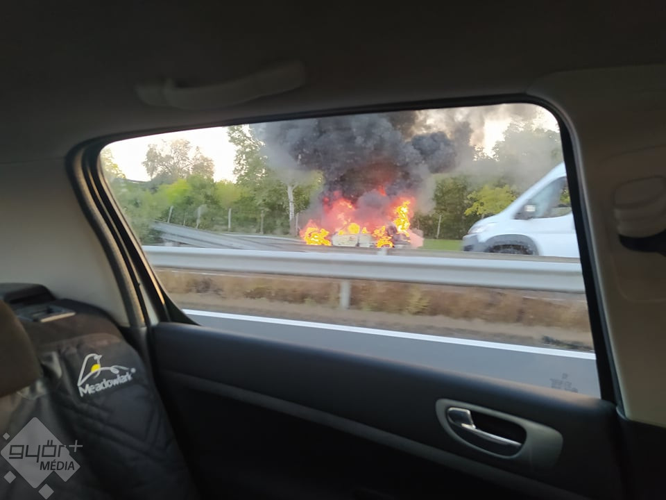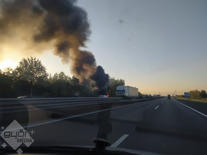 Helyszíni beszámolók szerint Mosonmagyaróvár és Levél között egy személyautó kapott lángra az M1-es autópályán.