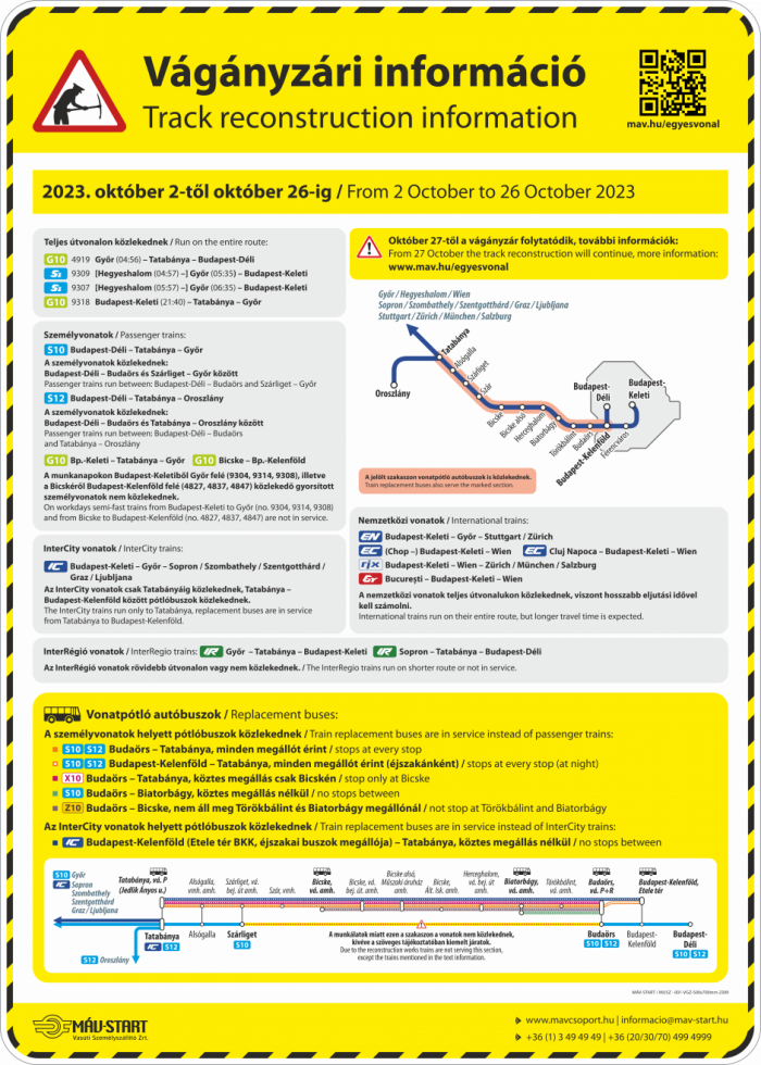 A fővárosból Tatabányára, illetve azon túl, Győr, Sopron vagy Szombathely felé utazóknak javasolják, hogy a Budapest-Kelenföld állomásról induló gyorsjáratú IC-pótlóbuszokat vegyék igénybe a több helyen megálló pótlóbuszok helyett. A helyjegy nélkül használható IC-pótló járatok az Etele téri BKK végállomásról (éjszaki buszok megállója) indulnak minden óra 45 perckor, 5:45 és 19:45 között.