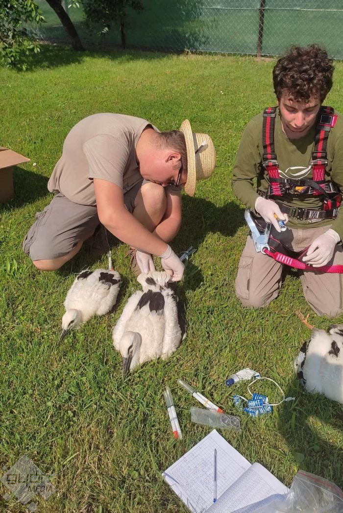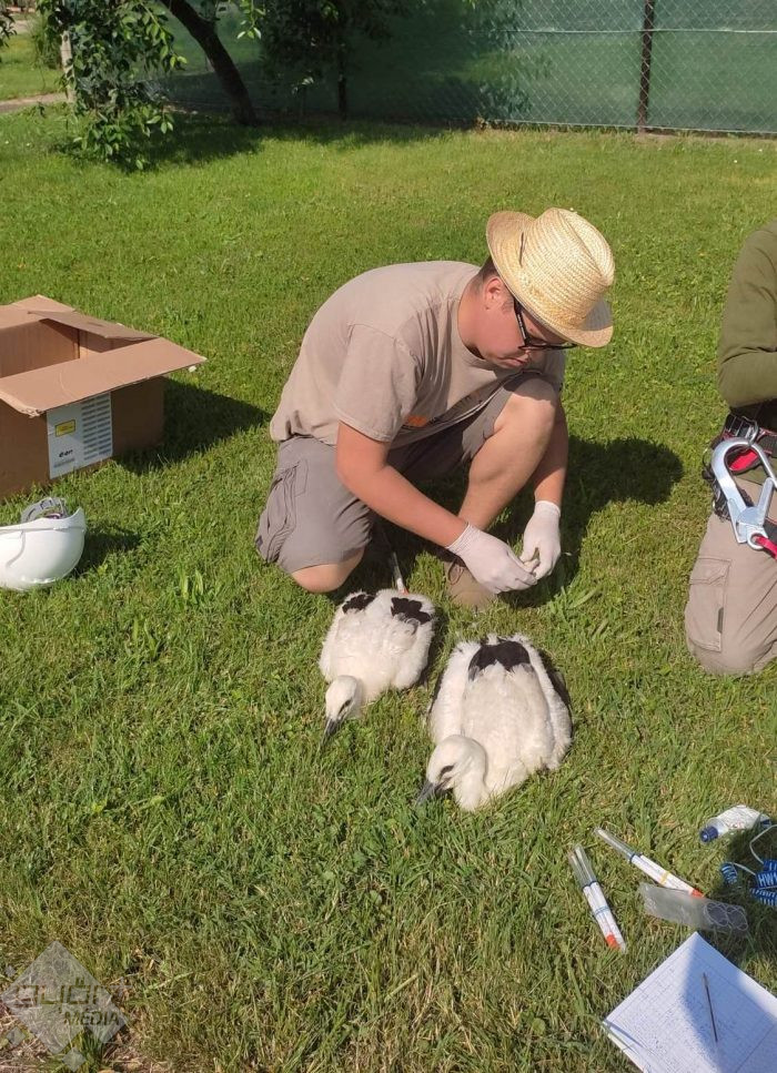 A fészekben három fióka volt: óvatosan dobozba emelték, majd úgy hozták le őket a fűre. Mindegyik megkapta a gyűrűjét, illetve az ilyenkor szokásos vizsgálatokon is átestek. Szerencsére mindegyik egészségesnek bizonyult.