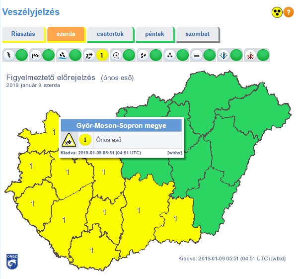 Többnyire erősen felhős vagy borult lesz az ég, csupán átmenetileg vékonyodhat, szakadozhat a felhőzet. Kezdetben többfelé számíthatunk csapadékra: havas eső, eső valószínű, néhol átmenetileg ónos eső is lehet. Emiatt megyénkre is figyelmeztetés érvényes.