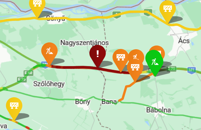 Az Útinform arról adott ki tájékoztatást szerdán délben, hogy a 97-es és a 96-os km között csak a belső sáv járható, 9 km-en keresztül lassulnak, torlódnak a járművek a Budapest felé tartó irányban.