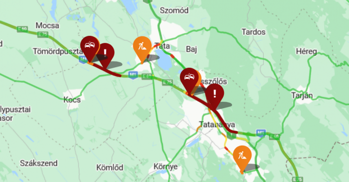 Az M1-es autópályán, Győr felé több baleset történt. A tatai szakaszon a 63-as km-nél a külső sávot zárták le. A torlódás 5-6 km-es.