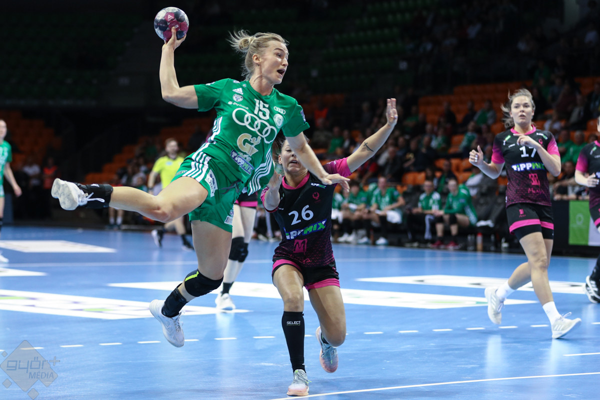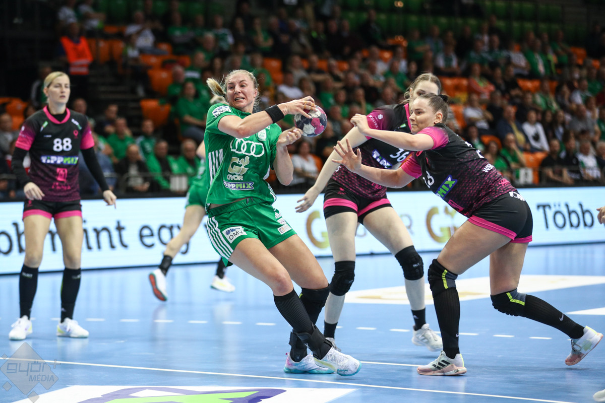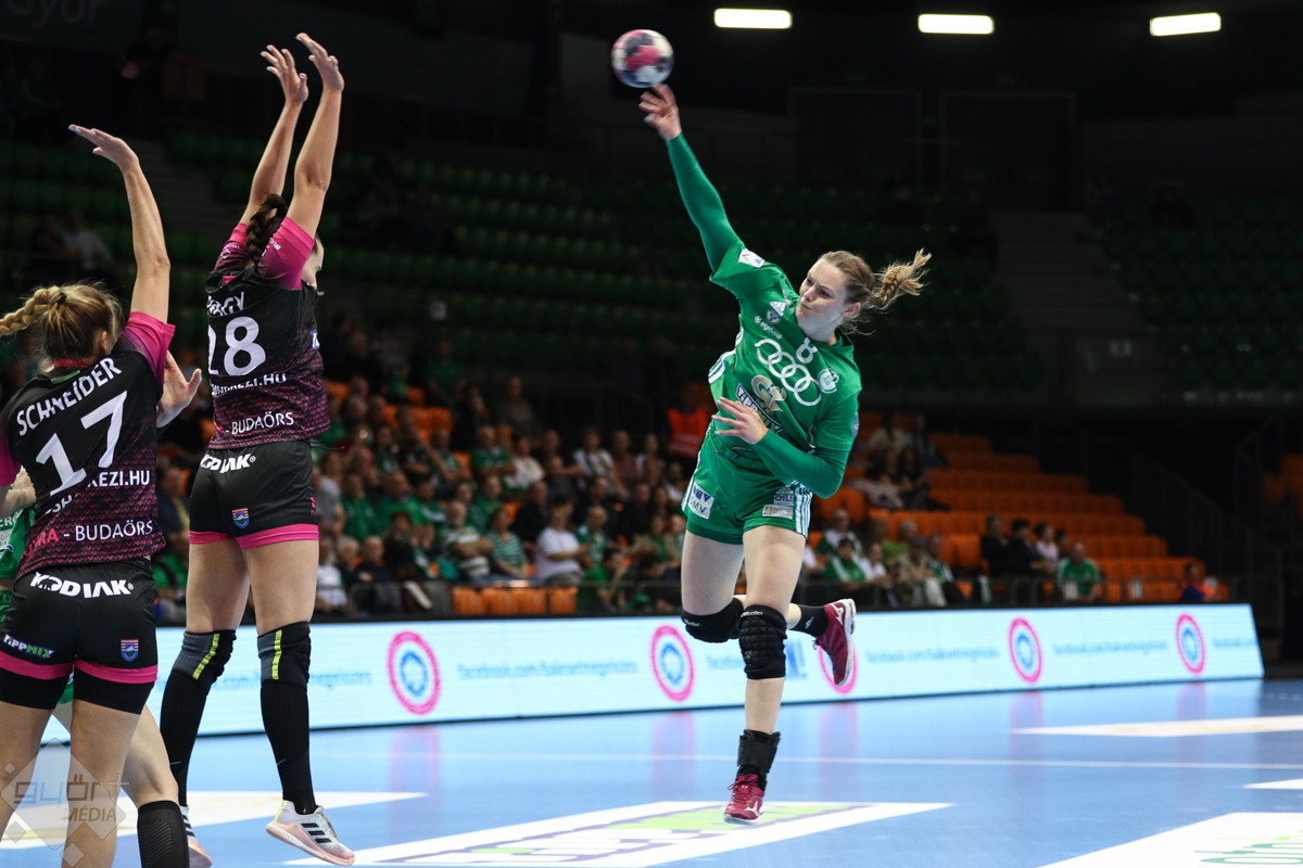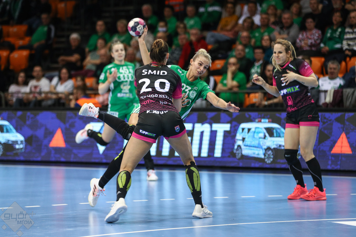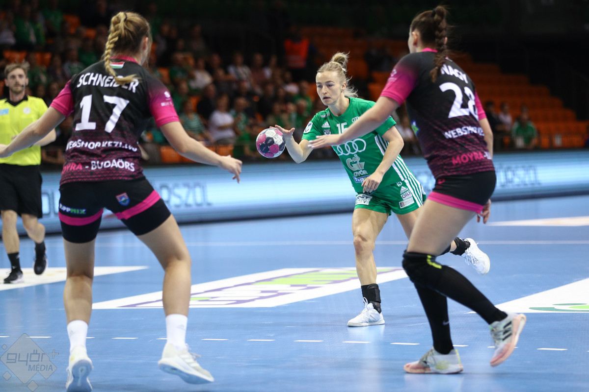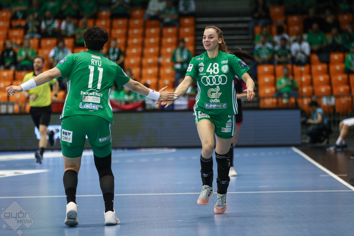 A Fodor, Oftedal, Hansen Blohm, Ryu, Faluvégi hatossal és Solberggel a kapuban kezdte meg a hazai csapat a találkozót. Az összecsapás egy 4-0-as győri sorozattal indult, és csak az ötödik percben tudtak először a remekül kezdő Solberg kapujába találni a vendégek (4 – 1). Negyedóra elteltével őrizte magabiztos előnyét a győri csapat, és Faluvégi góljával a 19. percben már 11 – 6-re vezetett. A félidő utolsó perceiben tovább nőtt a különbség a két együttes között, és végül az első félidő 21 – 13-as győri vezetéssel ért véget.