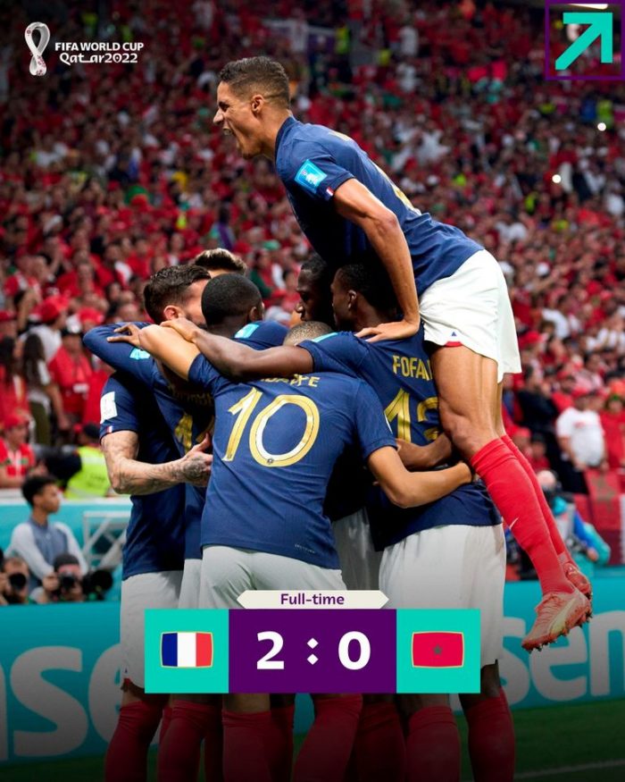 A franciáknak ez volt történetük hetedik vb-elődöntője, ezekből hármat – 1958-ban, 1982-ben és 1986-ban – veszítettek el, és immár négyet – 1998-ban, 2006-ban, 2018-ban és most – megnyertek. Marokkó a vb-k történetének 25. elődöntőseként és első afrikai csapatként futballozhat világbajnoki éremért szombaton, amikor Horvátország lesz az ellenfele a bronzmeccsen.