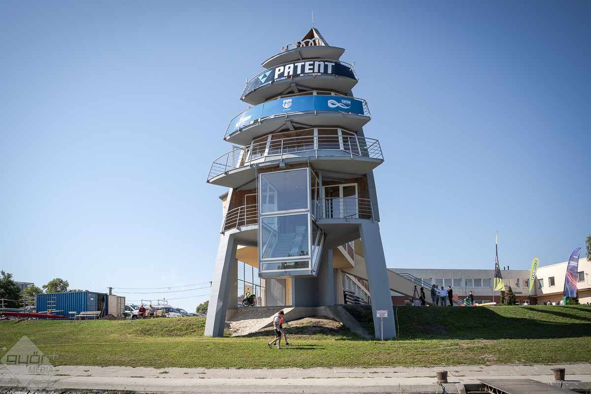 A négyszintes, egyre keskenyedő torony legalsó részén lesznek a célbírók, a következő szinten a versenyinformatika-, majd feljebb a célfotó-kezelők kapnak helyet. A torony mögötti részen alakították ki a versenybírók tárgyalóját, amit a hétköznapok során edzői irodaként használ a Patent Győri Vízisport Egyesület.