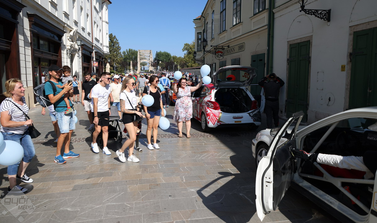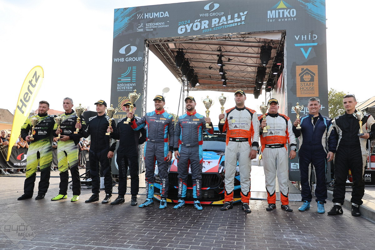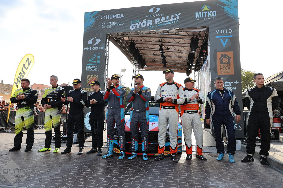 Javarészt elégedett versenyzők és a rajtceremóniához hasonlóan sok-sok szurkoló sorakozott fel a II. WHB Győr Rally céldobogójánál. A párosok mosolya a lebonyolításnak, az új szakaszoknak és természetesen a sok nézőnek szólt, aki pedig kicsit szomorkásan tekintett végig a Dunakapu tér sokadalmán, az inkább az eredmény miatt volt borús, mert jobbat remélt vagy magától, vagy a technikától.