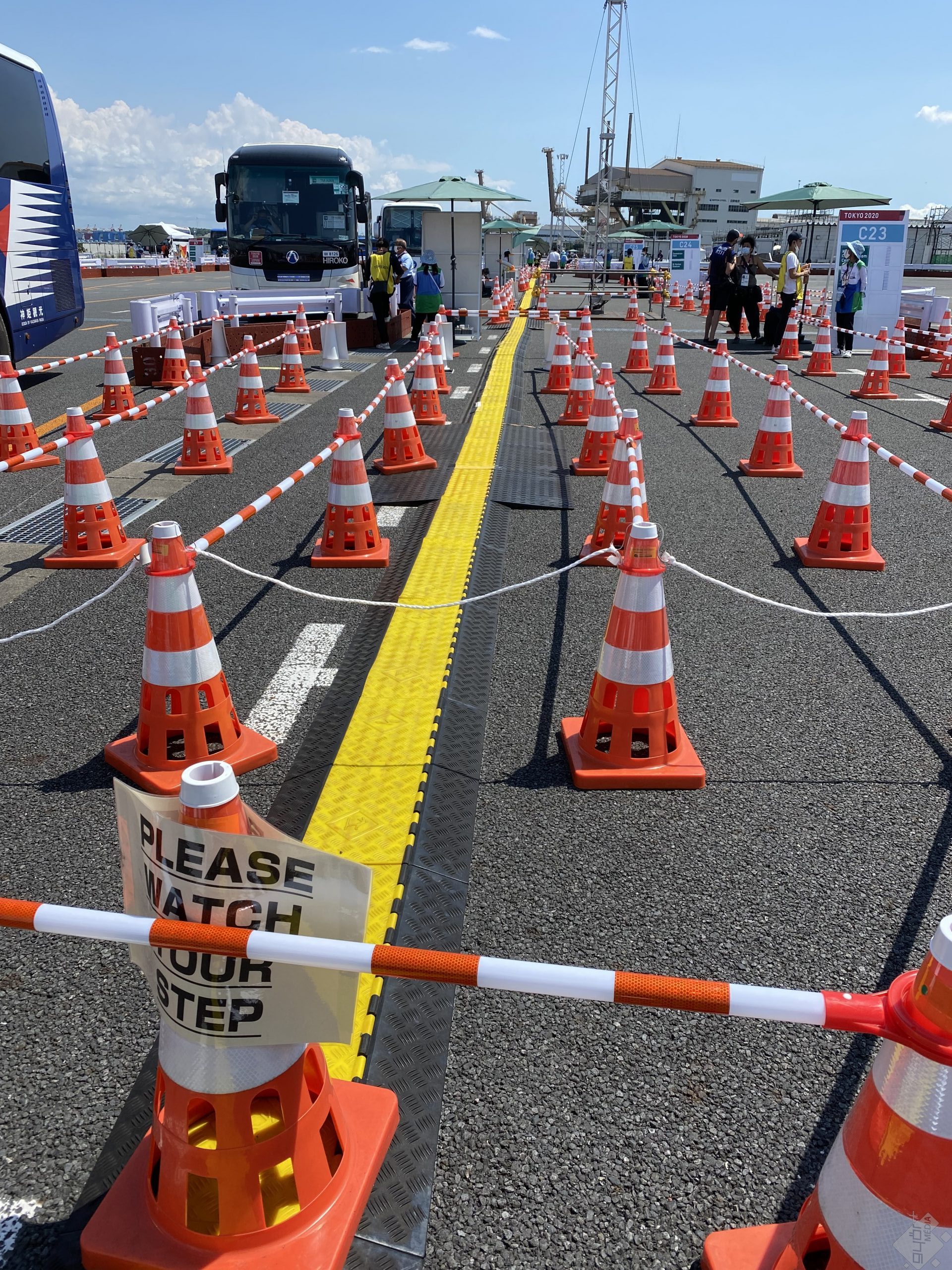 A repülőgép leszállássa után elkezdődött az a tortúra, amiről a Tokióba korábban érkezett kollégák már beszámoltak: tesztek és papírpecsételések végeláthatatlan sora. Az útlevelet és egyéb papírokat legalább ötször kérik el, ugyanennyiszer kell a telefonos alkalmazásokban generált QR-kódokat bemutatni, őt különböző pultnál, közben pedig úgy kell tetemes mennyiségűt köpni egy tölcsérbe a koronavírus teszthez, hogy közben leginkább vattát köpne az ember. Volt olyan magyar sajtós, aki nagynehezen, tíz perc nyűglődéssel teljesítette a mennyiséget, de az önkéntesnek kiesett a kezéből a kis kémcső, így kezdhette elölről.