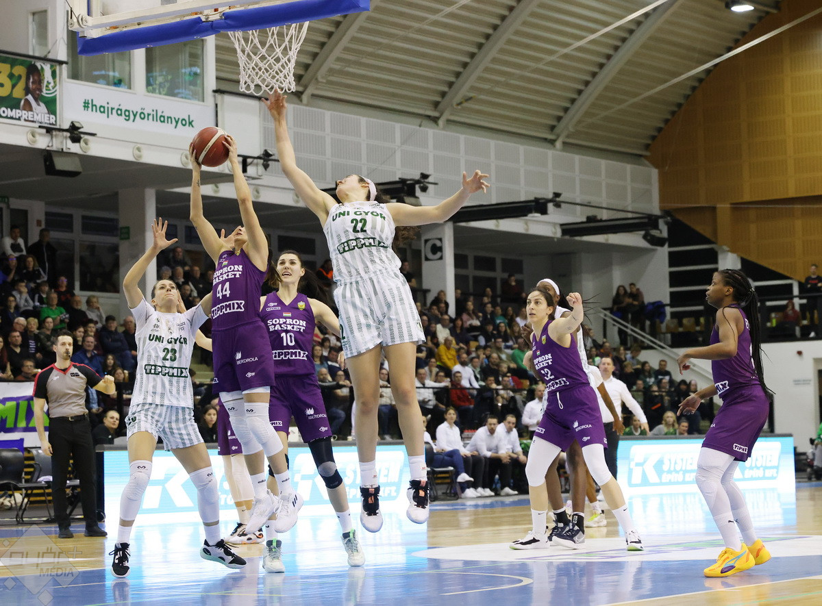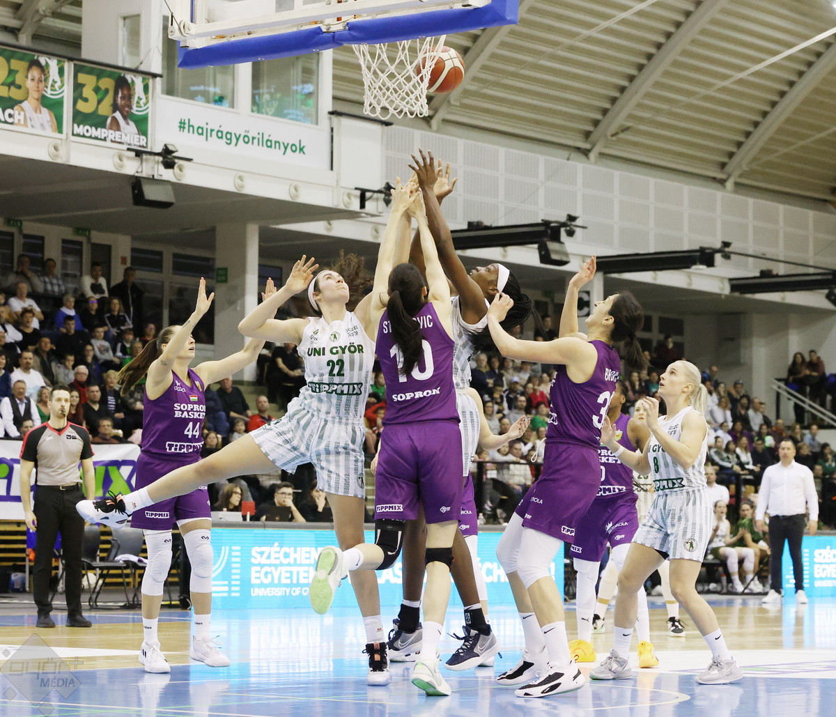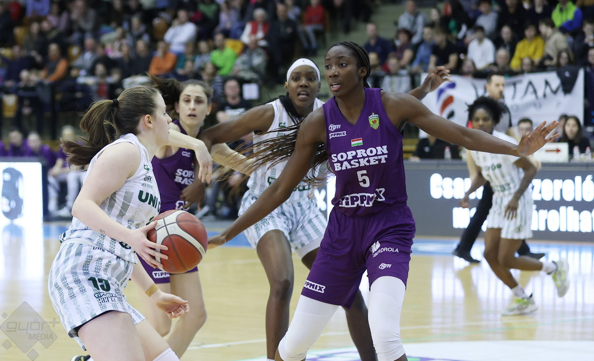 Rengeteg szurkoló volt kíváncsi a Győr – Sopron megyei rangadóra, az Egyetemi sportcsarnok mindkét hosszú lelátója megtelt, komoly hangulatot teremtve a csapatoknak. A 4-0-s győri kezdésre Brooks tudta az első soproni kosarat szerezni, majd át is vették a vezetést rögtön. A folytatásban fej-fej mellett haladtak a csapatok, az első negyed derekán egál volt az állás, 9-9. A vendégeknél főleg Jelena Brooks volt formában, hamar el is érte a 10 pontot. Győri oldalon Ellenberg és Mompremier vette hátára a csapatot az első negyedben, azonban az első 10 percet a vendégek vitték, 20-22-re.