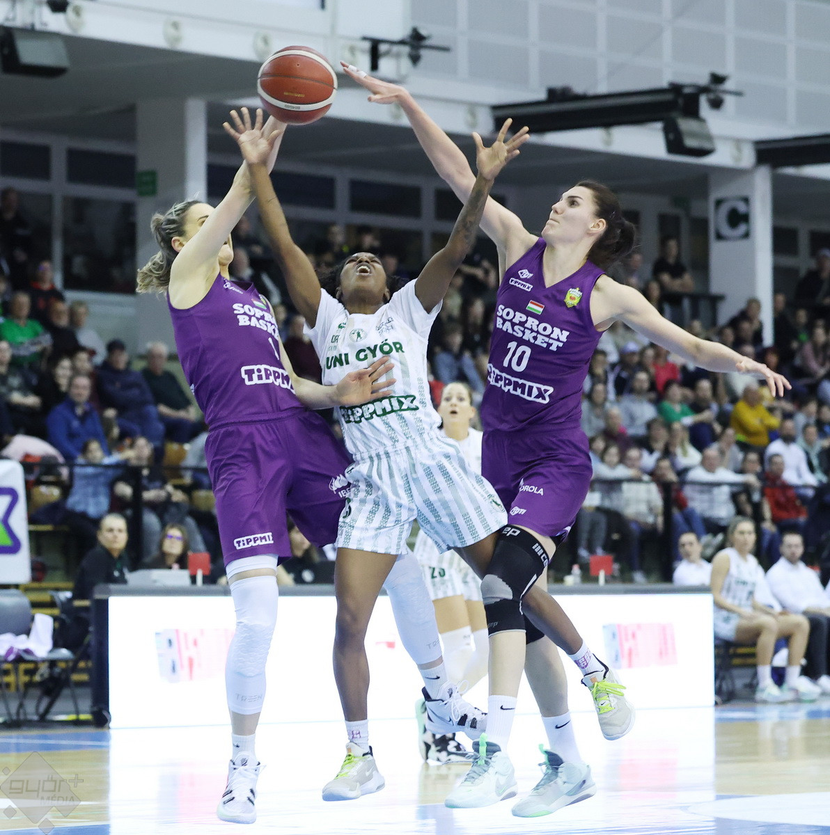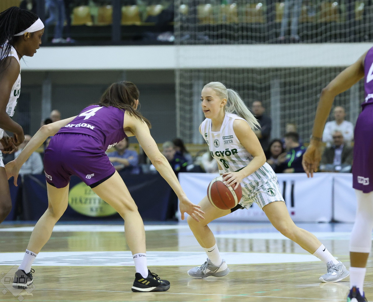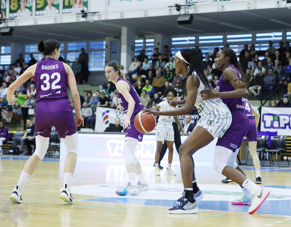 Rengeteg szurkoló volt kíváncsi a Győr – Sopron megyei rangadóra, az Egyetemi sportcsarnok mindkét hosszú lelátója megtelt, komoly hangulatot teremtve a csapatoknak. A 4-0-s győri kezdésre Brooks tudta az első soproni kosarat szerezni, majd át is vették a vezetést rögtön. A folytatásban fej-fej mellett haladtak a csapatok, az első negyed derekán egál volt az állás, 9-9. A vendégeknél főleg Jelena Brooks volt formában, hamar el is érte a 10 pontot. Győri oldalon Ellenberg és Mompremier vette hátára a csapatot az első negyedben, azonban az első 10 percet a vendégek vitték, 20-22-re.