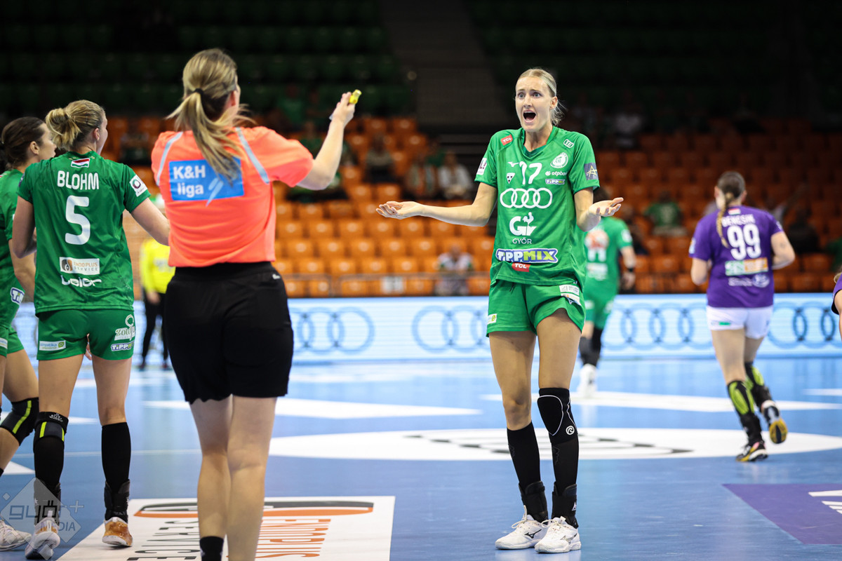 A vendégek szép kezdése után a vezető gólt a 10. percben sikerült megszerezni, de a csabaiak hamar válaszoltak, 7:7-re kerekítve az eredményt. A fej-fej mellett haladó pontgyűjtésből a mérkőzés 15. percében lépetek ki a hazaiak, a 12. győri találattal háromra növelték a gólkülönbséget. A lilák kiválóan tudtak élni a kínálkozó lehetőségekkel és hamar ledolgozták a hátrányukat, a 24. percben újabb egyenlítő találat született, ezúttal a békéscsabai gárda részéről: 14:14. A tétmérkőzés első félidejét 17:17-es eredménnyel zárták a csapatok.
