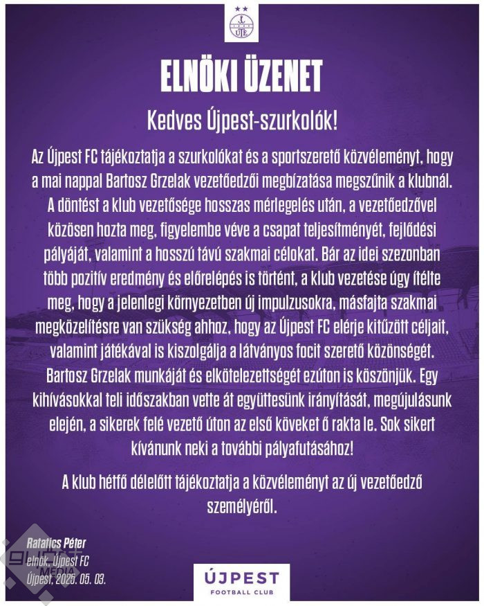 Már többször megszellőztették Bartosz Grzelak távozásának hírét az Újpest FC-nél, de a szombati, az ETO elleni mérkőzés után végképp betelt a pohár a klubvezetésnél és azonnali hatállyal menesztették a vezetőedzőt.