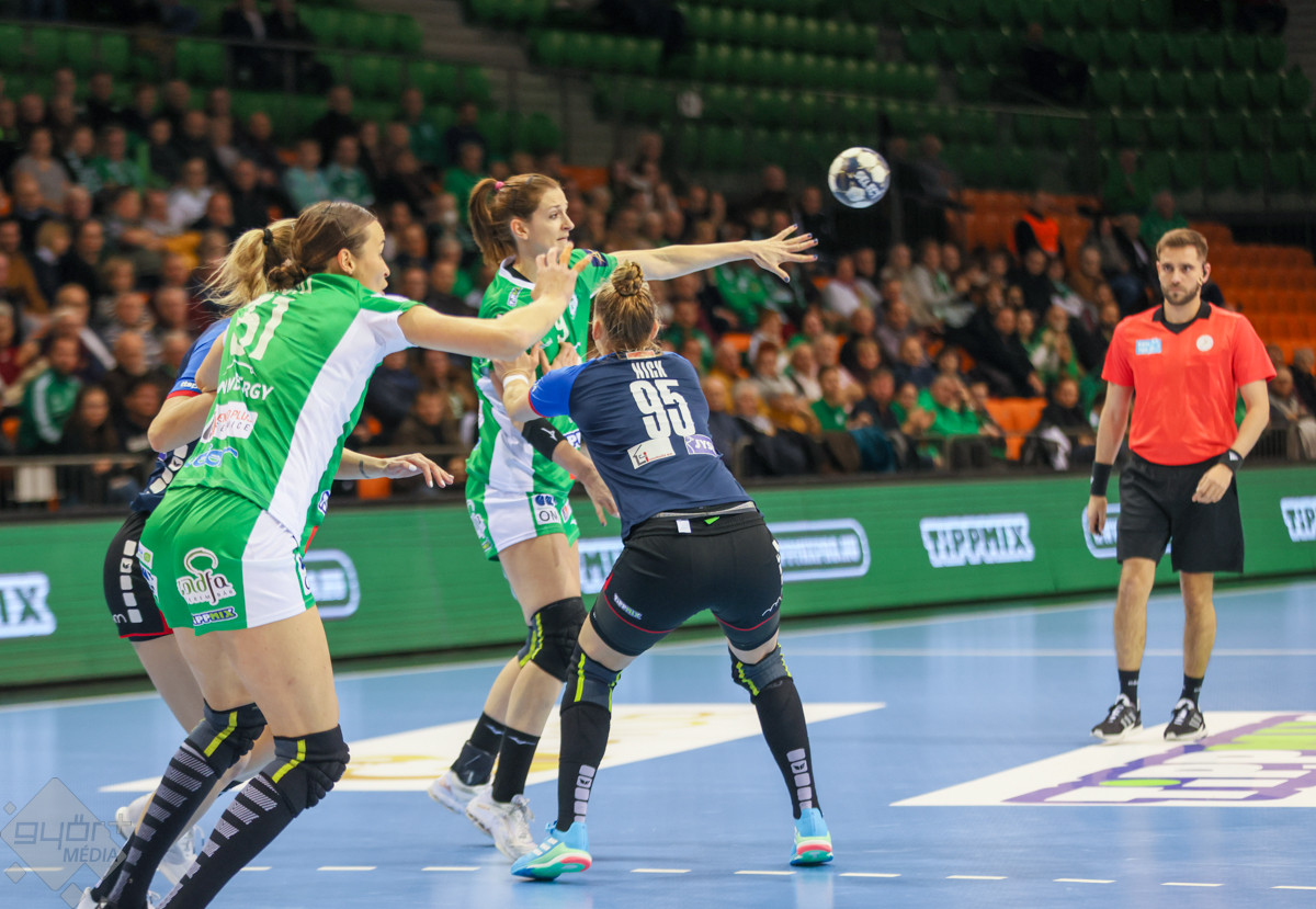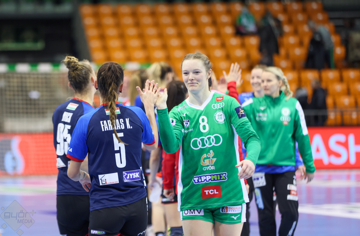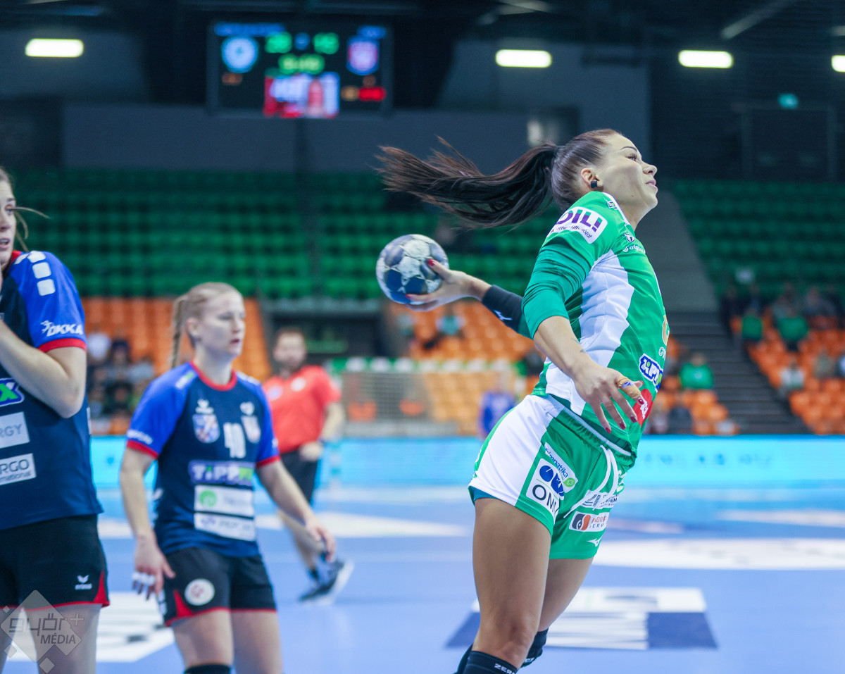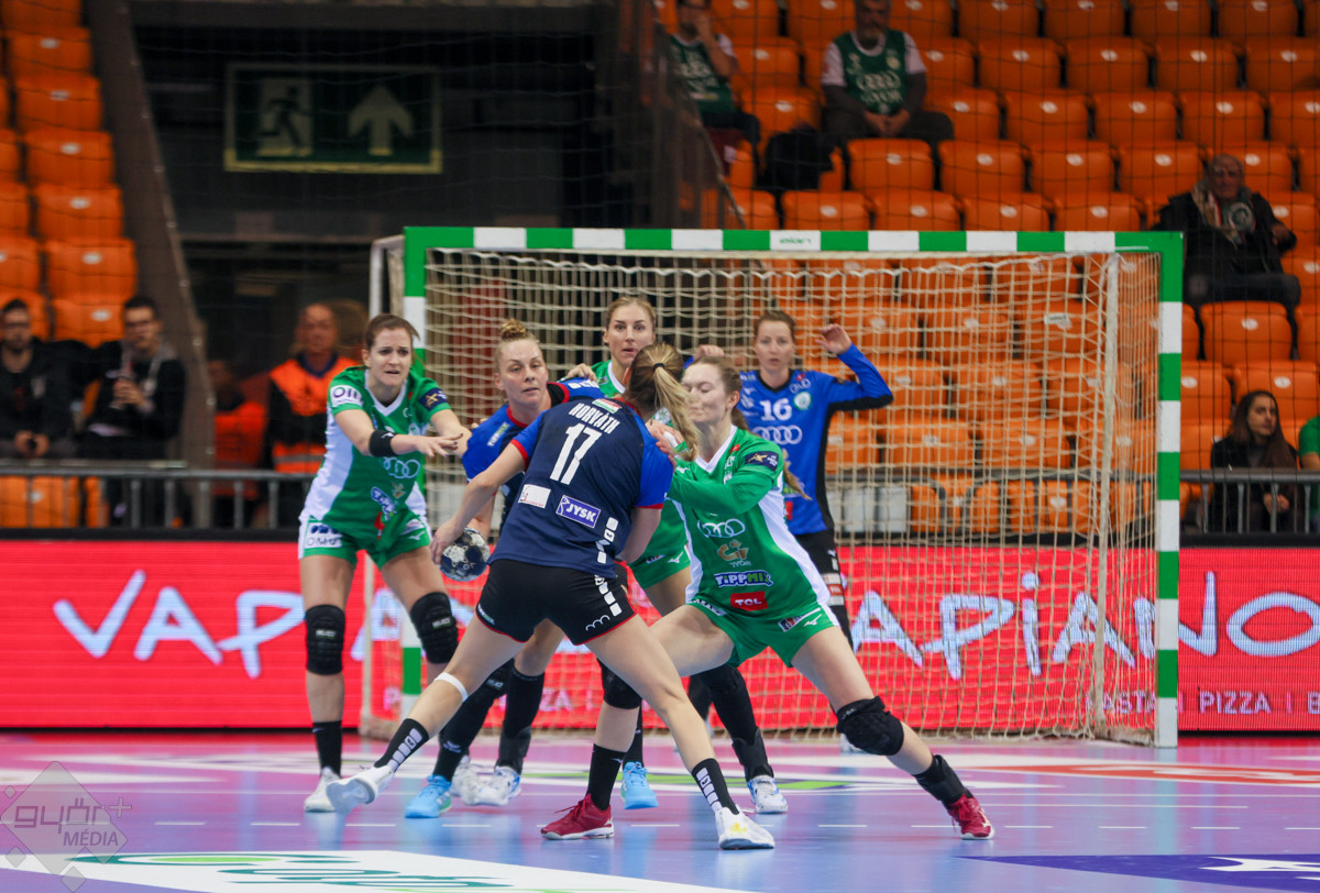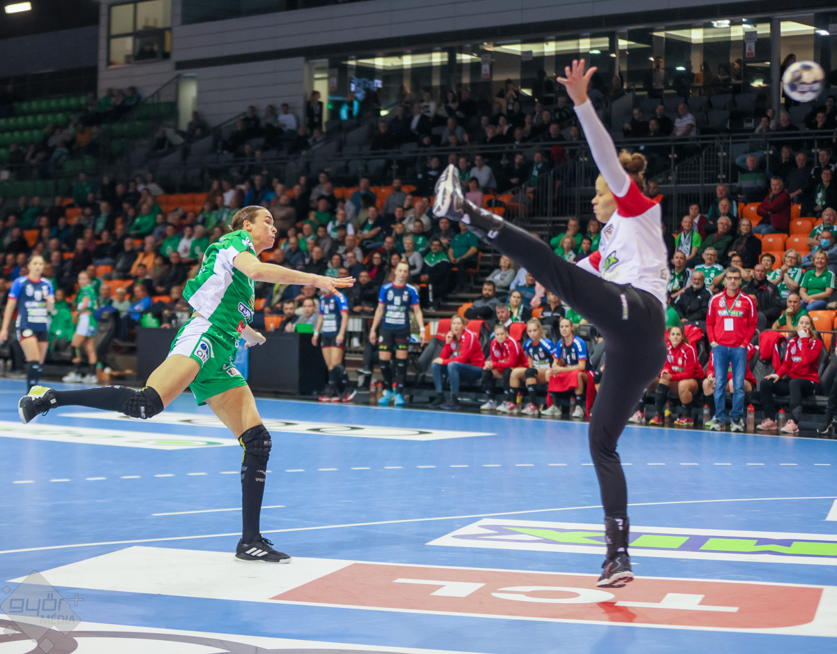 Ambros Martín vezetőedző a Faluvégi, Gros, Oftedal, Broch, Nze Minko, Schatzl hatossal és Tofttal a kapuban kezdte meg a mérkőzést. A találkozó első két gólját ugyan a vendégek szerezték, de egy 7 – 0-ás sorozatnak köszönhetően 7 – 2-re vezetett a győri csapat a tizedik percben. Sandra Toft védéseinek és a gyors lerohanásoknak köszönhetően a 18. percben már tíz góllal vezetett a csapat (13 – 3). A félidő utolsó tíz percére tizenhárom gólos győri előnnyel fordultak a csapatok (16 – 3). A győri kapuban hitetlen formában védett Sandra Toft, aki a 26. percben 75%-os hatékonysággal hárította a vendégek lövéseit. Az első félidő végül 22 – 7-es győri vezetéssel zárult.